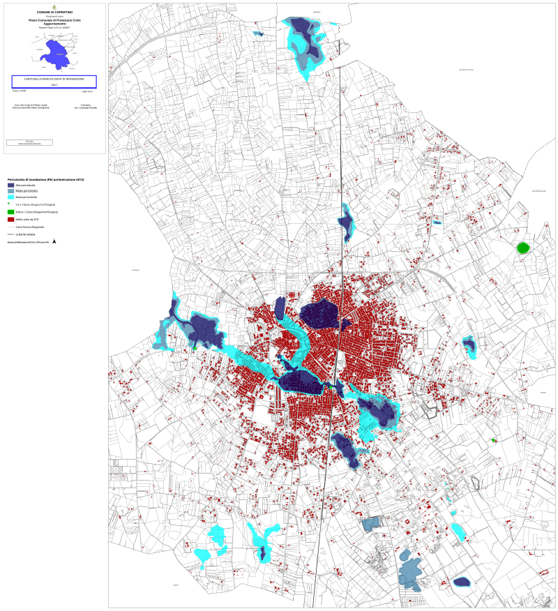 - Le aree a pericolosità e rischio idraulico, sono state sovrapposte alla cartografia comunale e regionale (PUTT, PPTR, Beni culturali) e sono state analizzate al fine di predisporre una cartografia utile al piano di protezione civile.